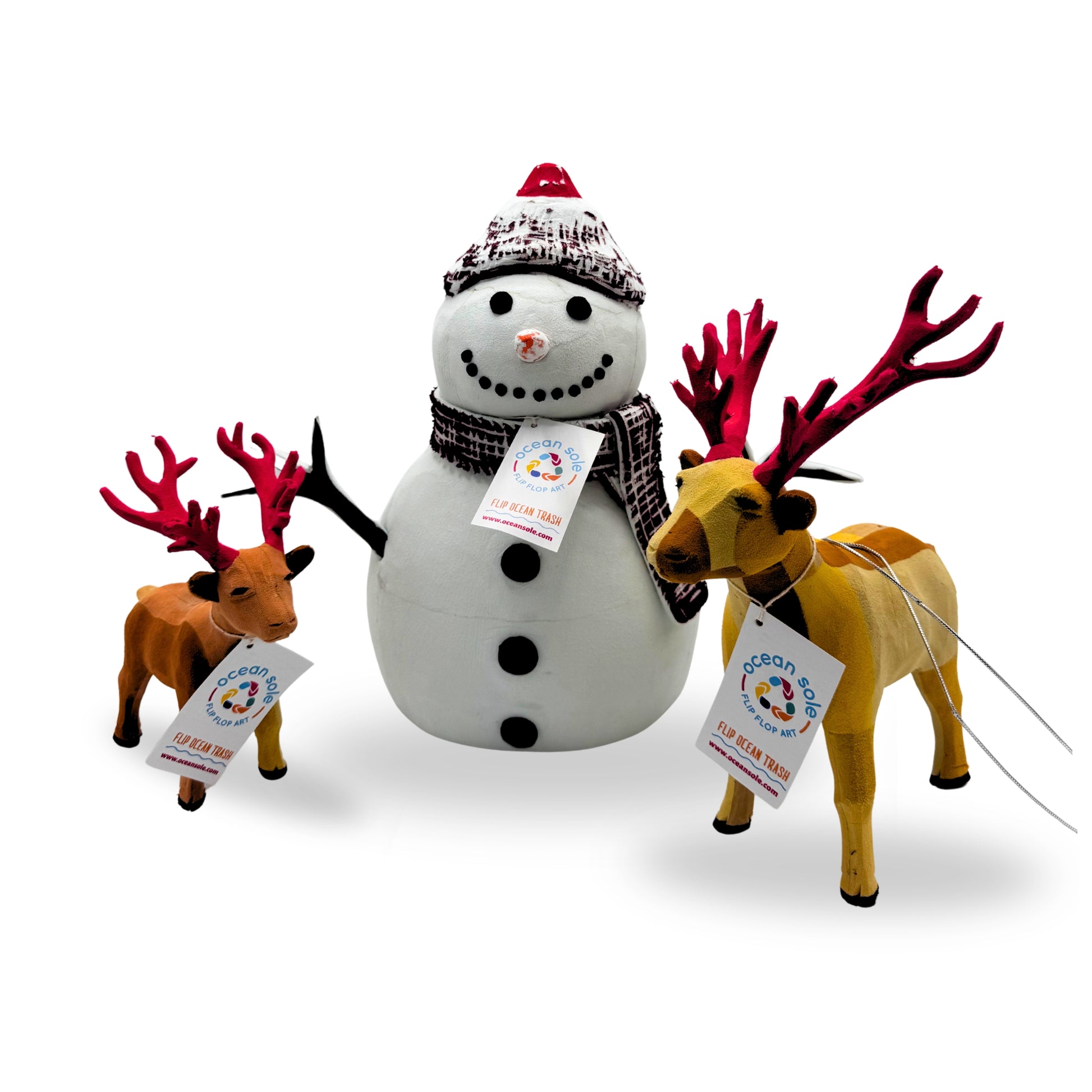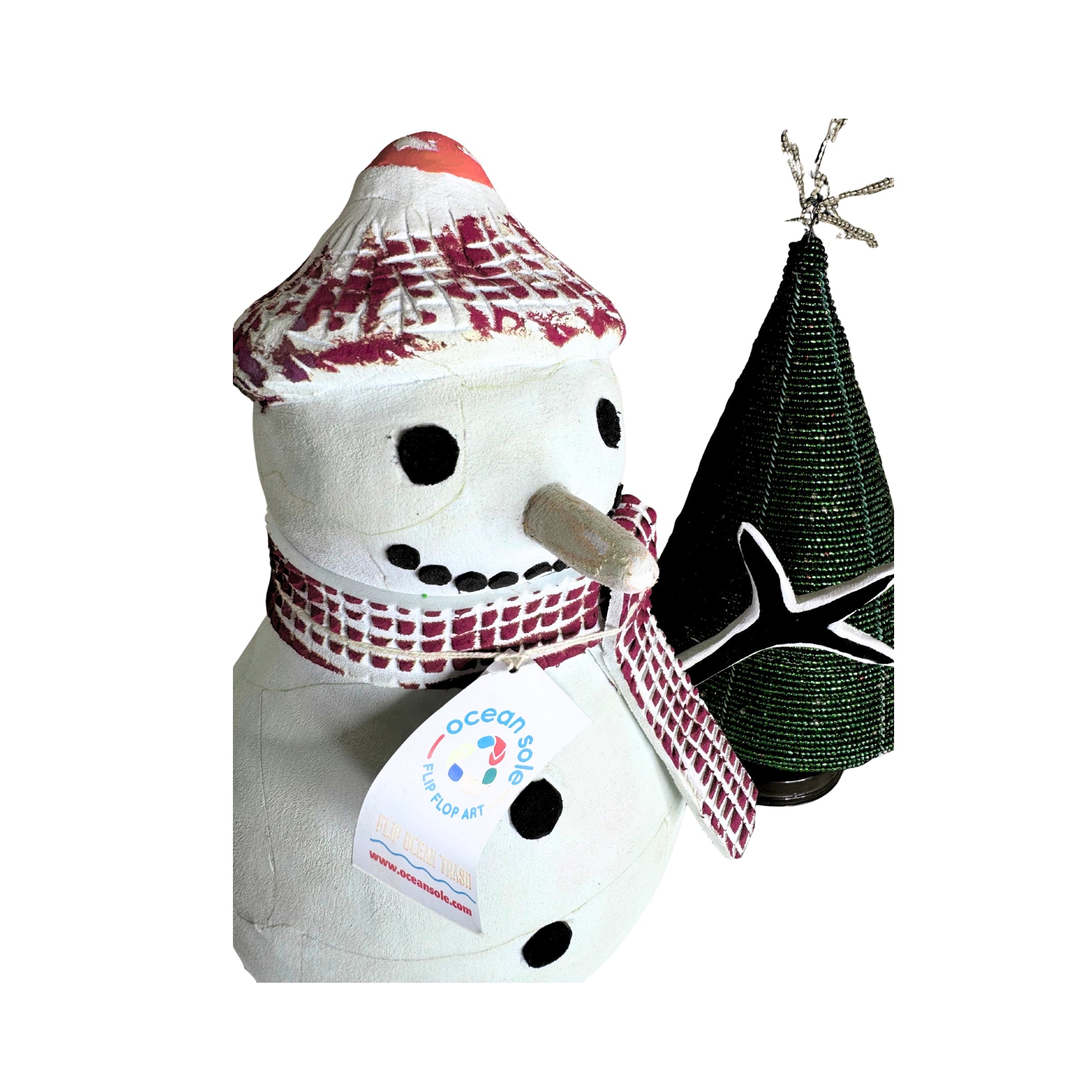 Celebrate the holidays sustainably with our vibrant snowman sculpture. Carved from recycled flip-flops by Kenyan artisans, this eco-friendly centerpiece brings festive cheer, unique artistry, and a powerful story of ocean conservation to your home or garden.