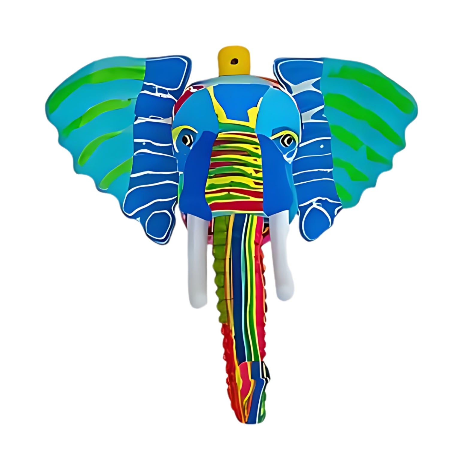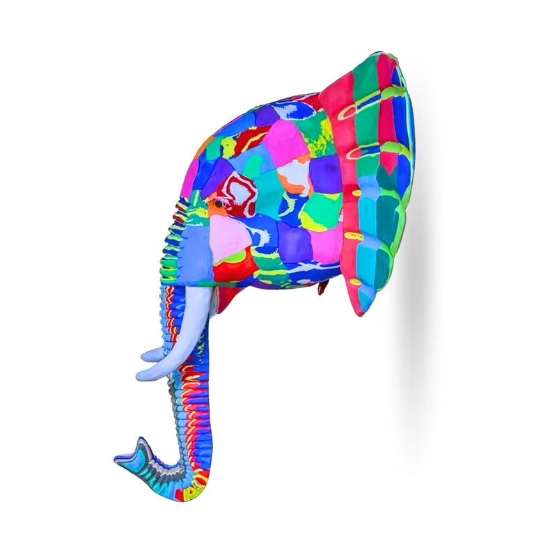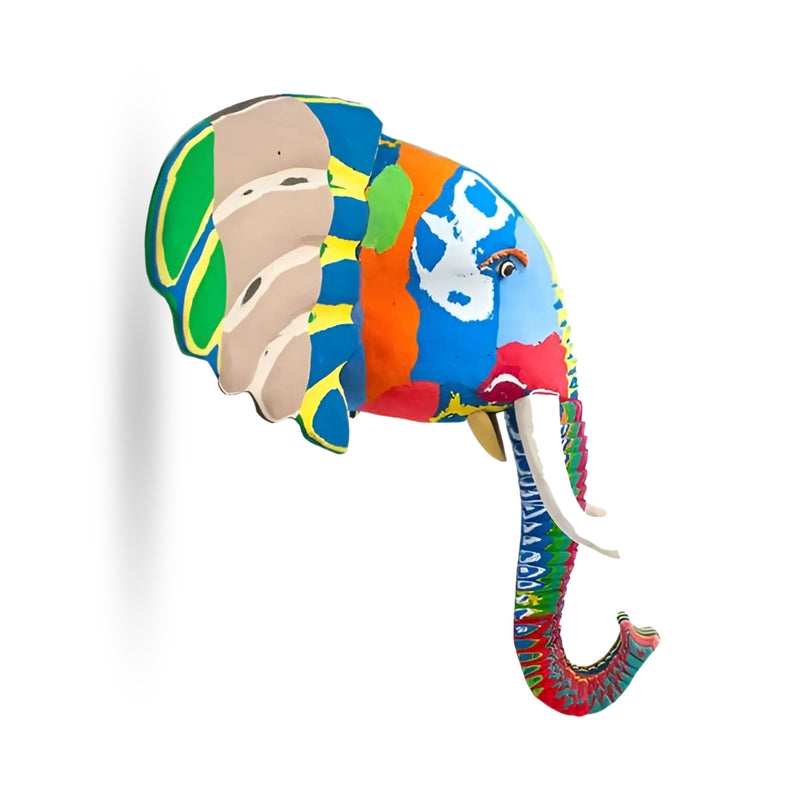 Hand-carved multicolored elephant wall art sculpture made of upcycled flip flops by Ocean Sole designed to hang on your wall.