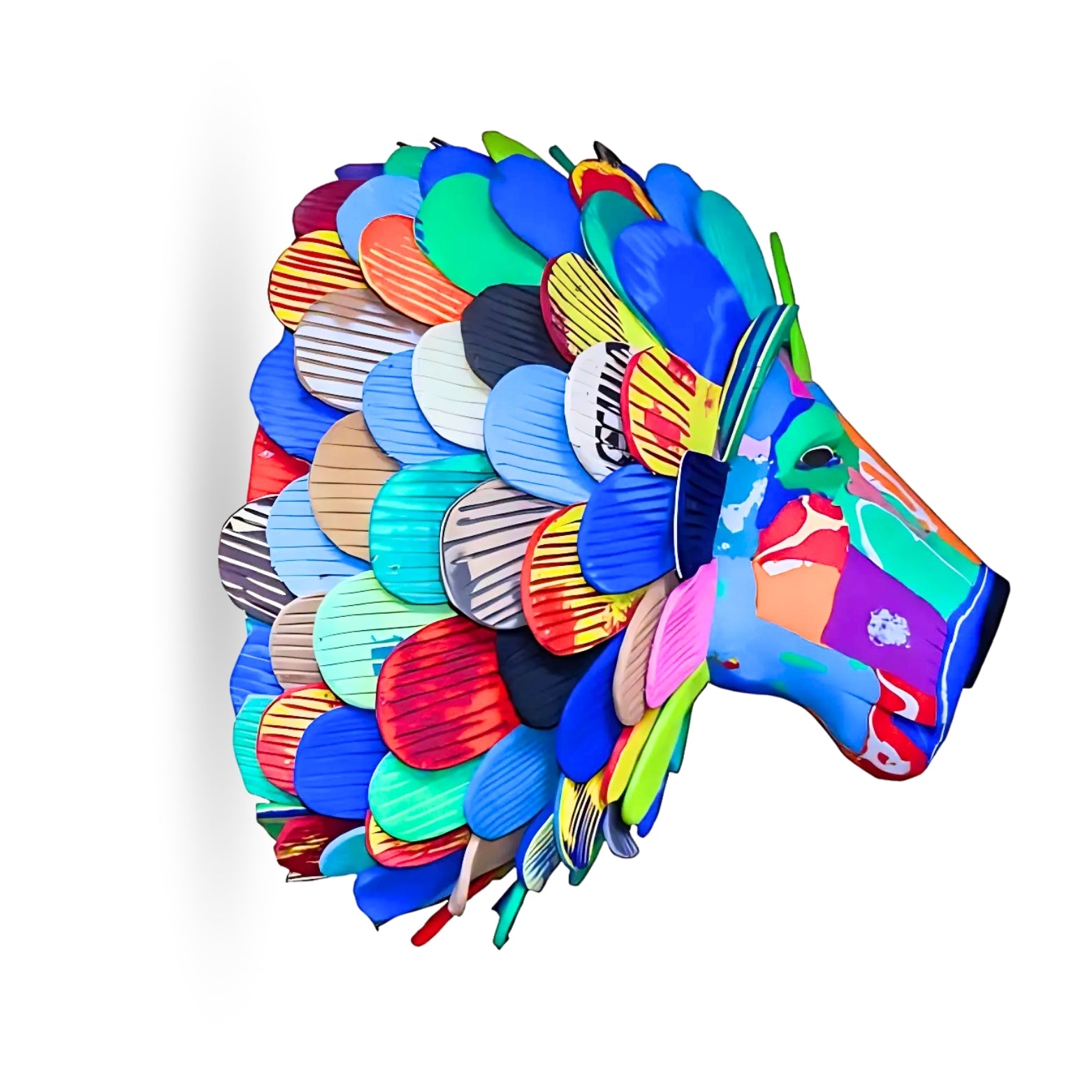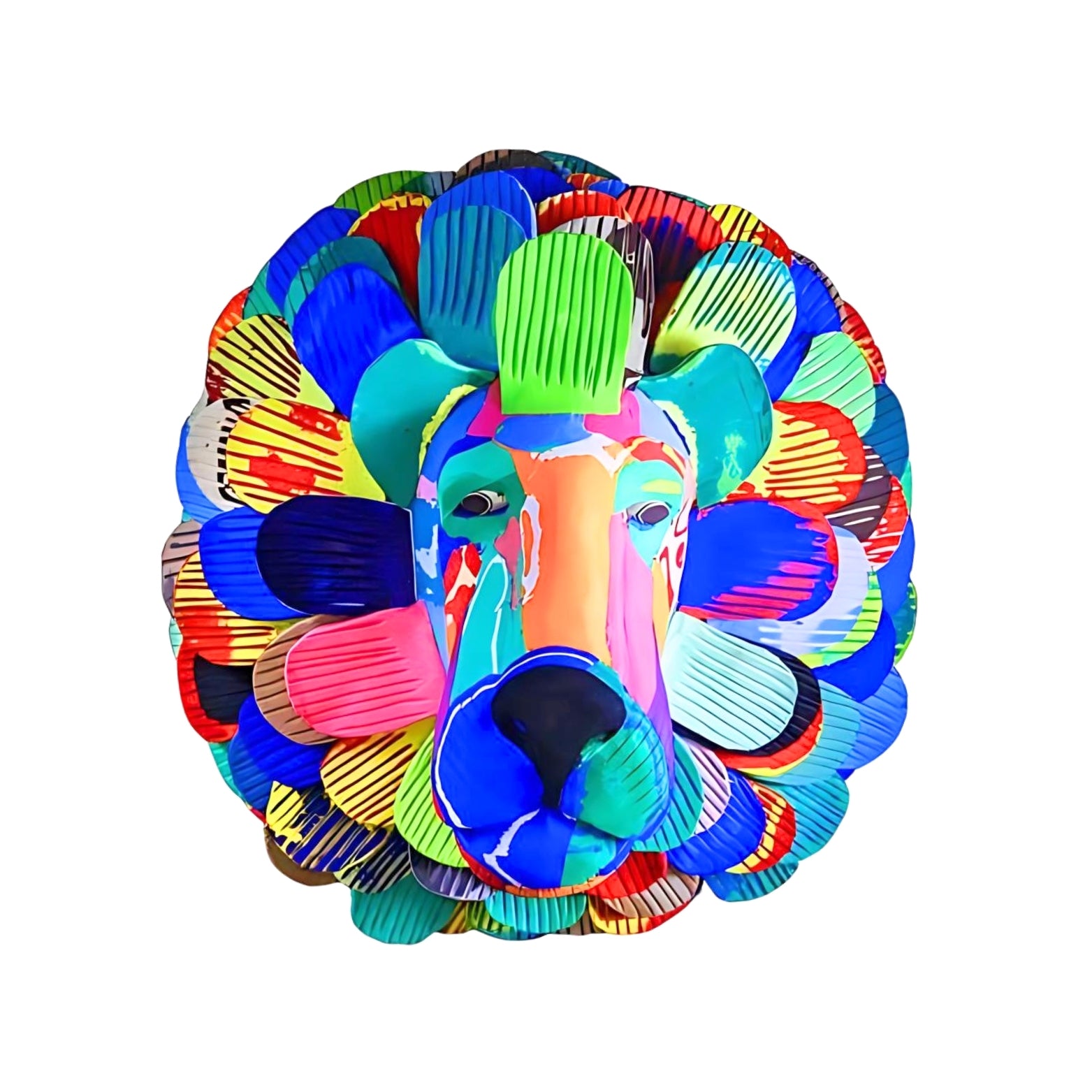 Hand-carved multicolored lion wall art sculpture made of upcycled flip flops by Ocean Sole designed to hang on your wall.