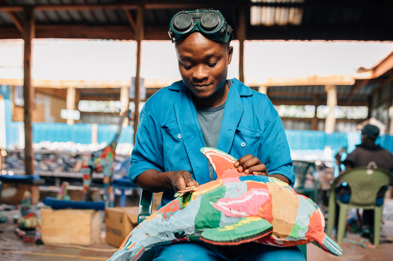 Each sculpture begins its life as a discarded flip-flop — worn, tossed, and often swept into our oceans. We collect it from beaches and waterways, then clean, compress, and hand-carve every piece at our Nairobi workshop. No machines. Just skilled artisans, purposeful design, and a whole lot of love.