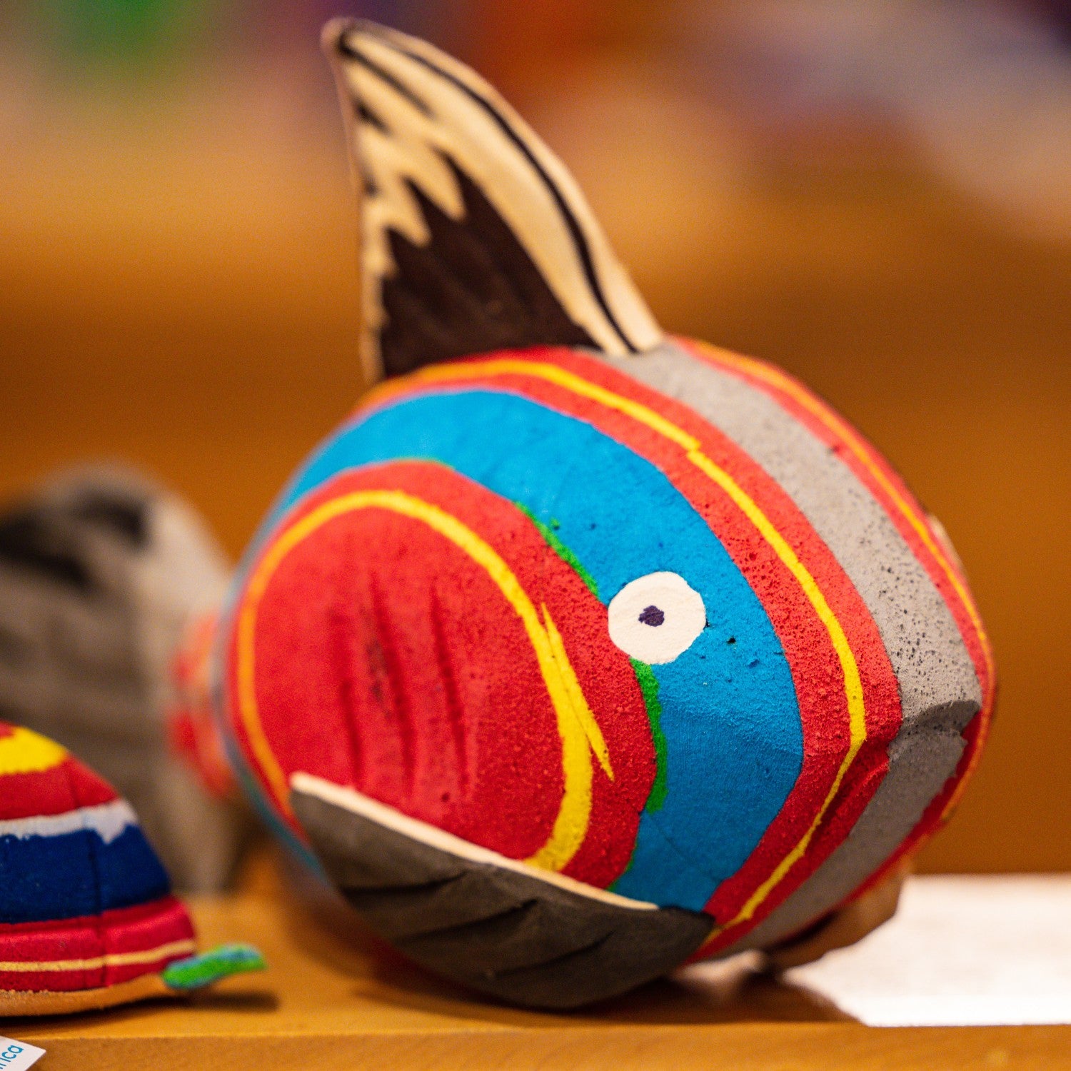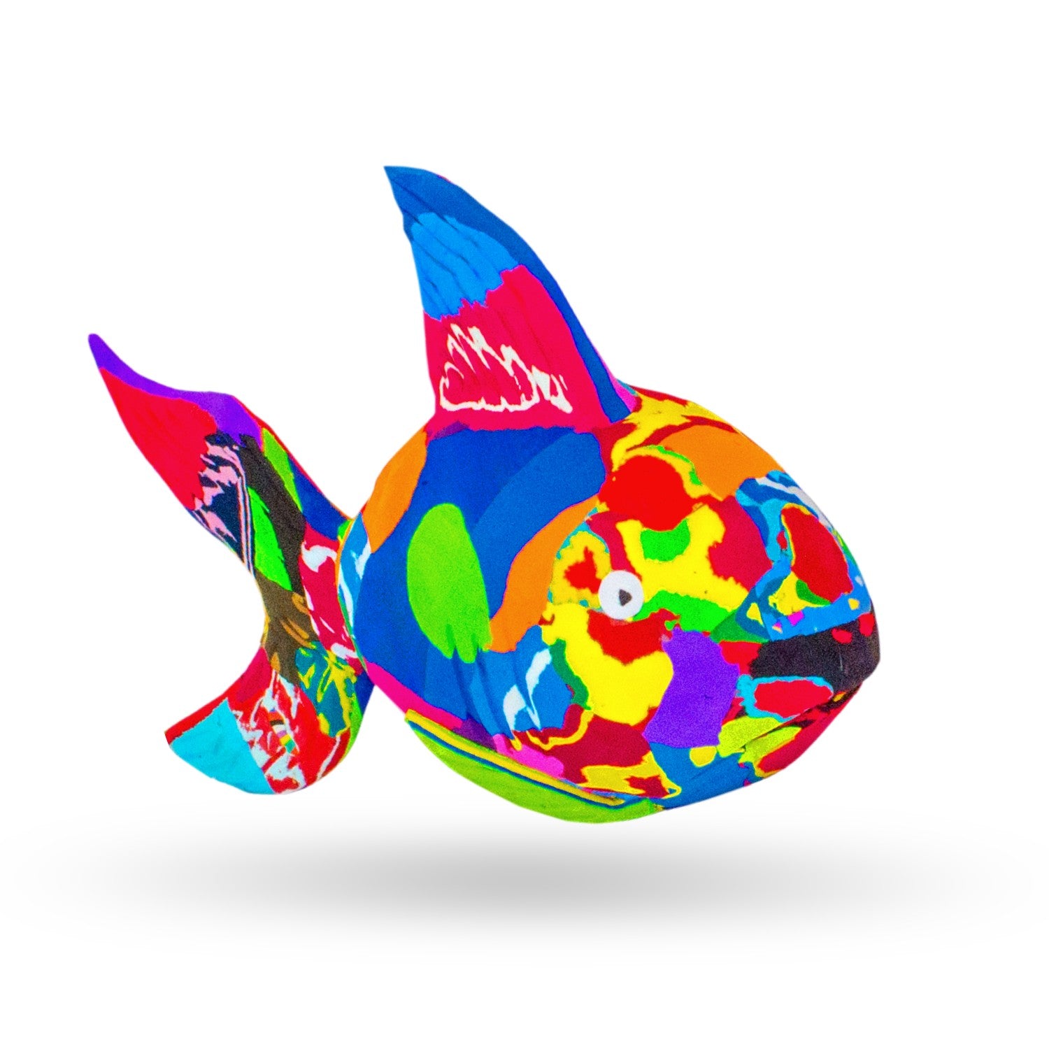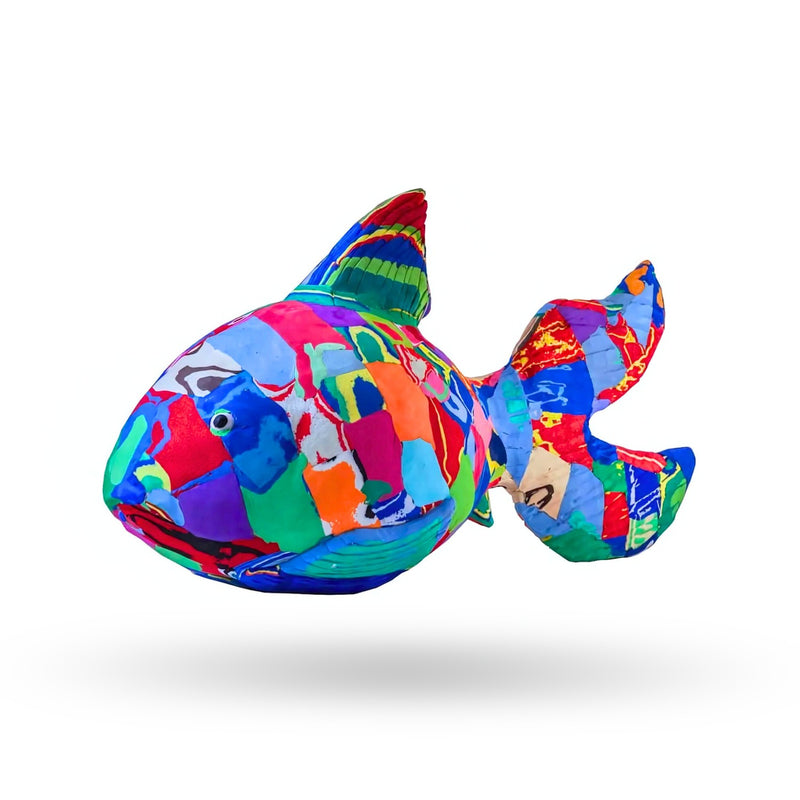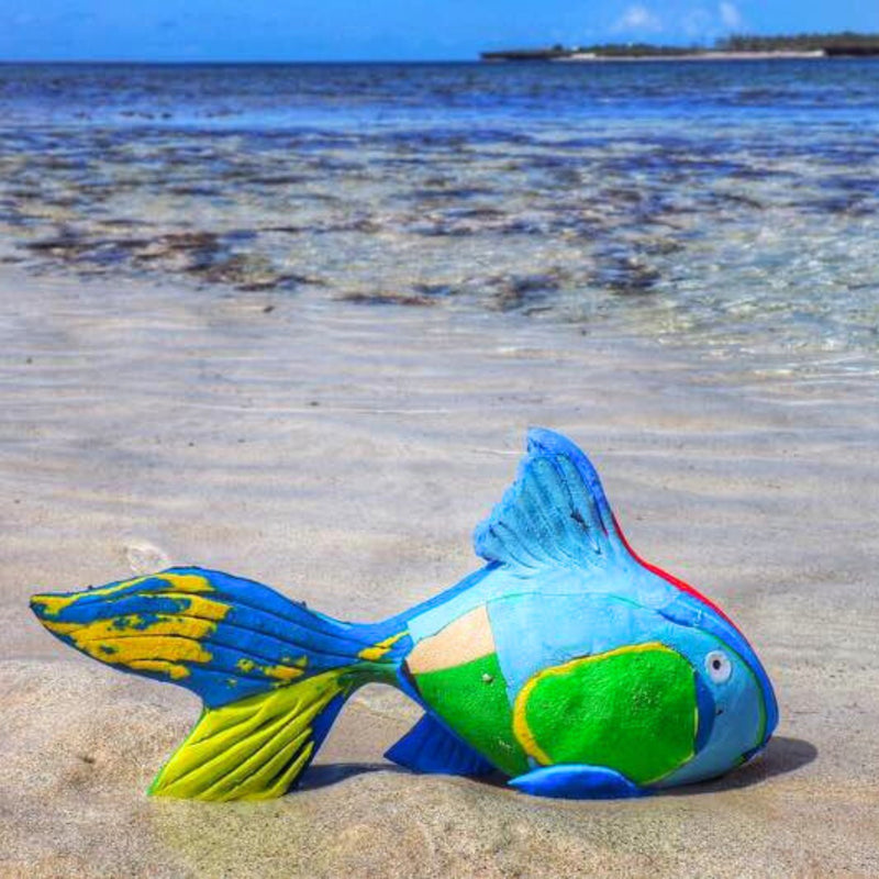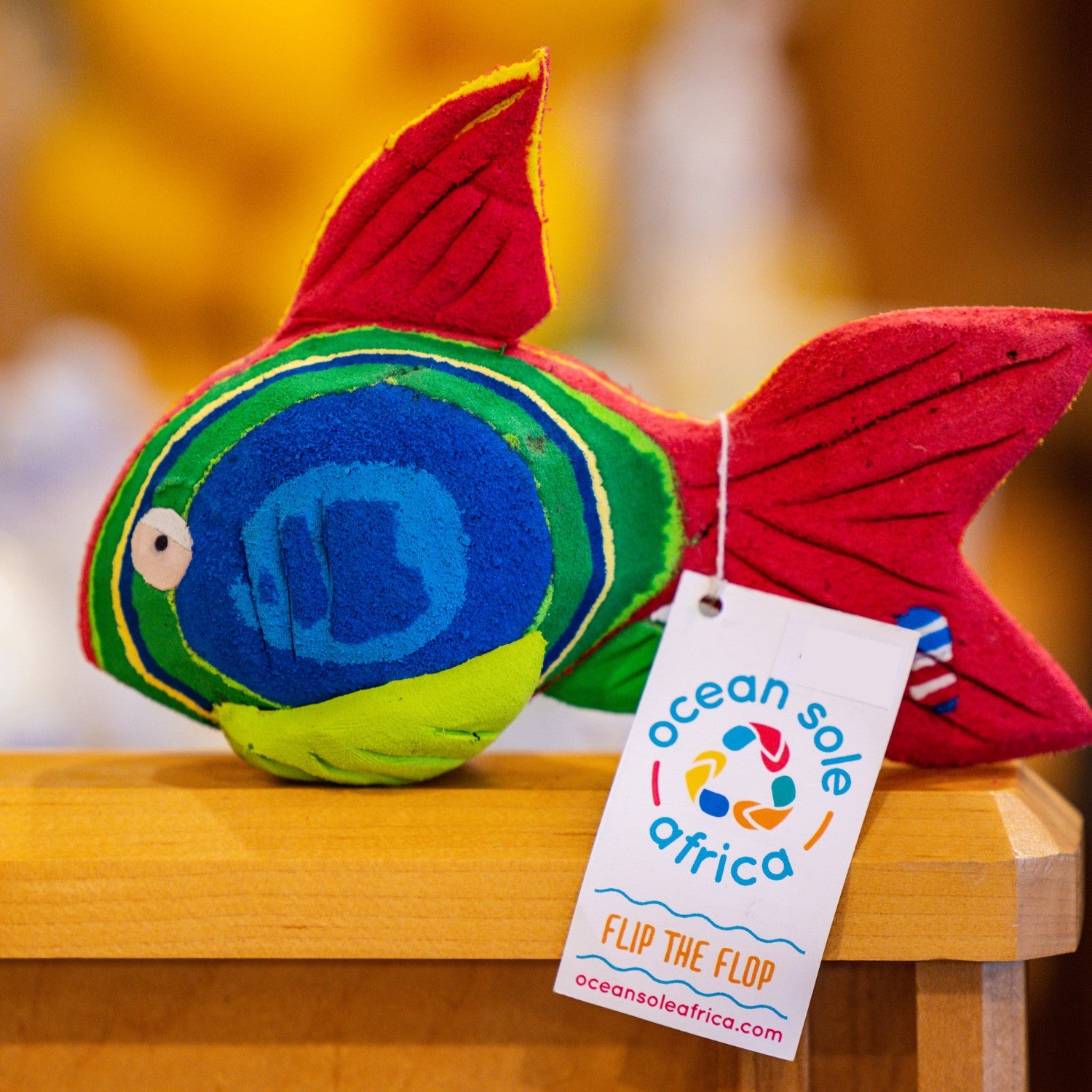 Hand-carved multicolored reef fish sculpture made of upcycled flip flops by Ocean Sole.
